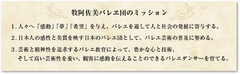 創設以来、芸術性豊かな心躍る舞台をつくり、かけがえのないひと時をお客様にご提供することを心掛け、また、世界中のバレエファン共通の財産として広く親しまれておりますクラッシックバレエを中心に捉えながら、新しい時代の創造性溢れる作品にも積極的に取り組み、ますます充実したステージをご覧頂けますよう、常に挑戦を続けております。